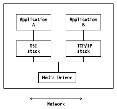 Although this is a relatively straightforward approach, it involves a fundamental drawback: two networks will be running over the same set of wires, but the two sets of protocol cannot interoperate. Users are forced to choose between them. This disadvantage of having two separate networks can be an advantage. Those users who want to use TCP/IP can use TCP/IP, those who want to use OSI can use OSI. Another advantage is that an existing TCP/IP network will not be disturbed. But, dual stacks are memory-intensive, and they have to be put on every machine on the TCP/IP-OSI networks.