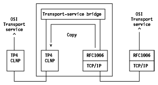 In a TCP-to-TP4 example, a transport-service bridge would make the TCP service look like a TP4 service. You accomplish this by emulating the TP4 service. With transport-service bridges you can run OSI applications over TCP/IP networks. One advantage of this approach is that you can use just one application protocol-OSI. Only the underlying layers need change between the two environments. A transport-service bridge is essentially a router that copies PDUs, as opposed to translating them. RFC 1006 defines the way to produce OSI transport services on top of TCP. The main disadvantage of this approach is that you do not have end-to-end (source to destination) checksum. In the example of TCP-to-TP4 environment, you have a TCP checksum on the source side of the transport-service bridge and a TP4 checksum on the destination side. Like gateways, transport-service bridges introduce a single point of failure. You can use transport-service bridges not only for TCP/IP-to-OSI implementations but also for OSI-to-OSI integration jobs. For example, OSI includes different transport protocols, such as TP0 for wide area networks and TP4 for local area networks. Transport-service bridges are viable candidates for linking those different OSI transports.