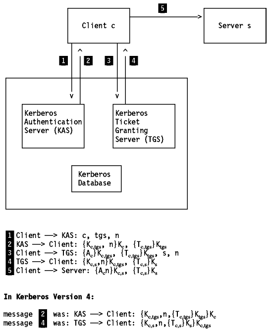 In the Kerberos system, a client that wants to contact a server for its service, first has to ask for a ticket from a mutually trusted third party, the Kerberos Authentication Server (KAS). This ticket is obtained as a function where one of the components is a private key known only by the service and the Kerberos Authentication Server, so that the service can be confident that the information on the ticket originates from Kerberos. The client is known to the KAS as a principal name (c). The private key (K(subscript c)) is the authentication key known only to the user and the Kerberos Authentication Server (KAS).