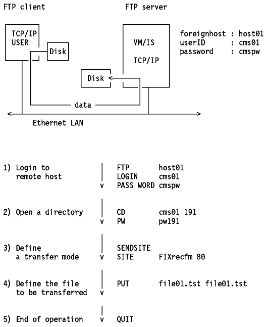 [C:\SAMPLES]ftp host01.itsc.raleigh.ibm.com Connected to host01.itsc.raleigh.ibm.com. 220 host01 FTP server (Version 4.1 Sat Nov 23 12:52:09 CST 1991) ready. Name (rs60002): cms01 331 Password required for cms01. Password: xxxxxx 230 User cms01 logged in. ftp> put file01.tst file01.tst 200 PORT command successful. 150 Opening data connection for file01.tst (1252 bytes). 226 Transfer complete. local: file01.tst remote: file01.tst 1285 bytes received in 0.062 seconds (20 Kbytes/s) ftp> close 221 Goodbye. ftp> quit