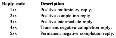 For each user command, shown like this, the FTP server responds with a message beginning with a 3-digit reply code, shown like this: