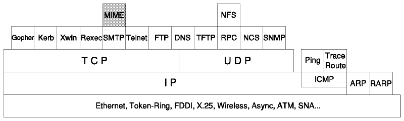 MIME can be seen as a high-level protocol; since it works entirely within the boundaries of STD 10 and STD 11, it does not involve the transport layer (or lower layers) of the protocol stack at all.