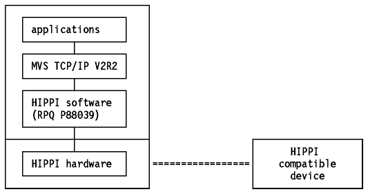 The HIPPI software (RPQ P88039, program number 5799-DKW) makes the function of the HIPPI available to the HIPPI application programs. MVS TCP/IP V3R1 is one such program.