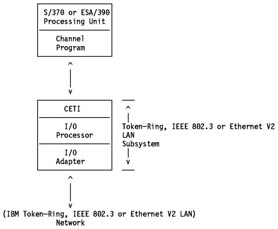 The CETI interface allows communication from S/370 and ESA/390 hosts to all other IEEE 802.3, Ethernet Version 2, and IEEE 802.5 LAN-attached hosts, controllers, workstations and devices where matching line protocols are available. This includes the attachment of non-IBM network controllers.